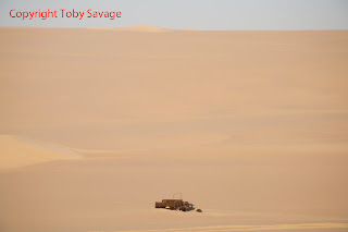 Camping in the desert is a wonderful experience. Watching the sun set over massive dunes, settling down around a good fire, then falling into a tent as the night chill begins to bite. On this trip up through the Great Sand Sea we had little of that. A persistent strong and dust filed wind from the south for the first few days, swinging round to a northerly for the last two days. The problem with this was that it happened in the middle of the night. We retired with a hot sticky southerly - tent doors facing north, but as the wind swung round in the night our tents morphed into a wind blown shapes and filled with at least a bucketful of sand each! Bob reported that he went out for a pee in the night and could not see a thing for the swirling sands. The wind hit a maximum of 37 kph according to data retrieved by Jason upon our return. Character building stuff!